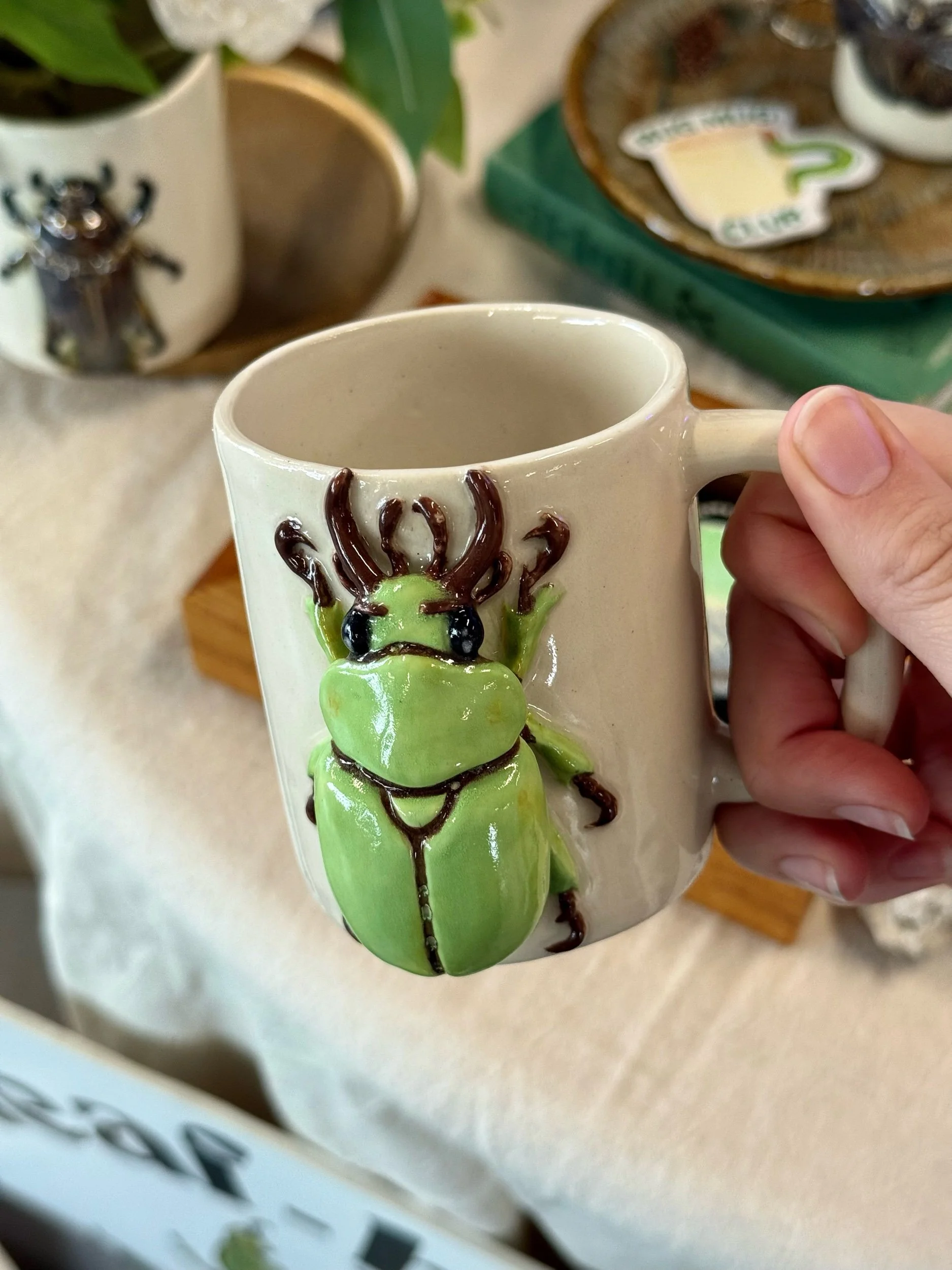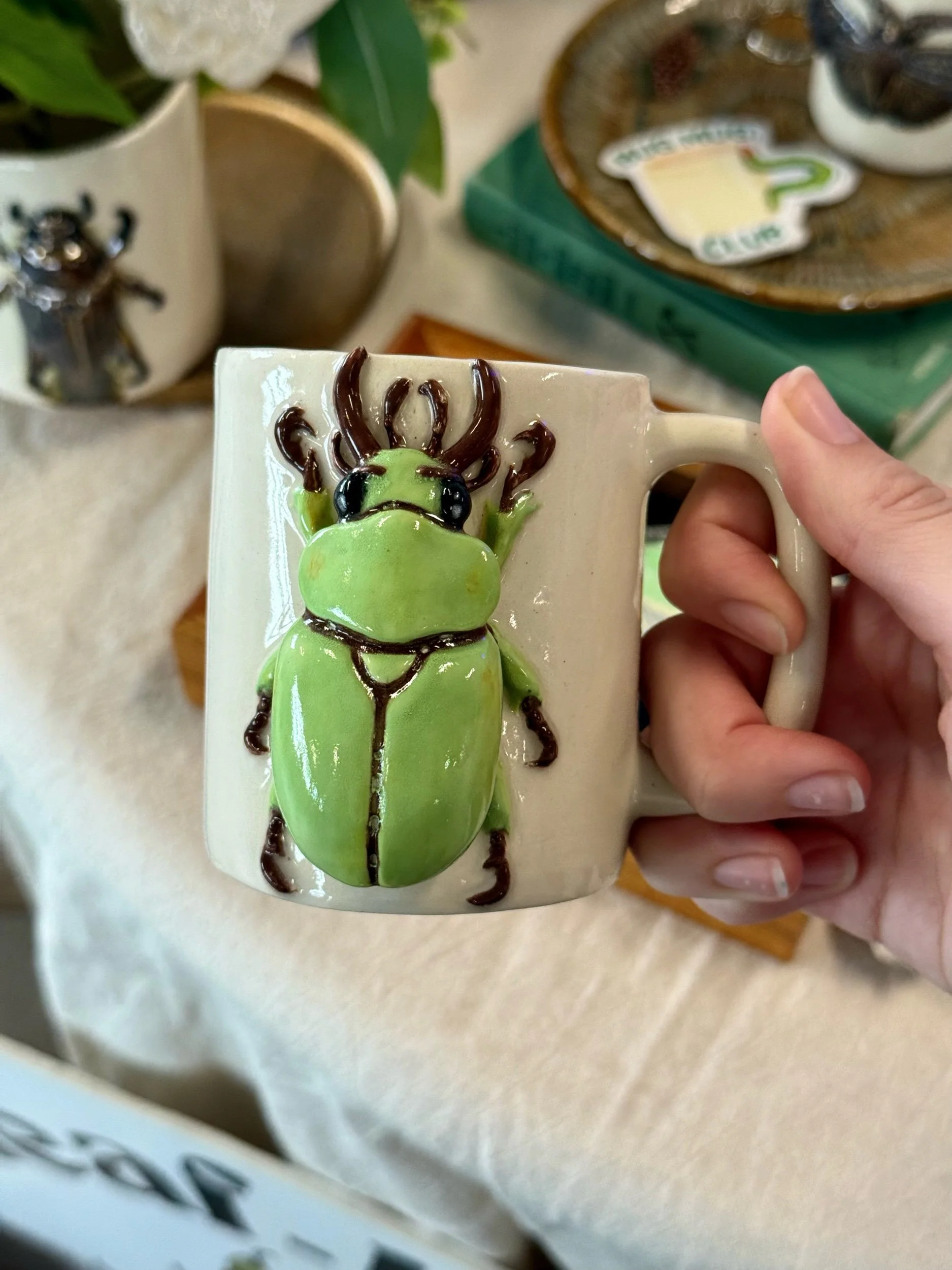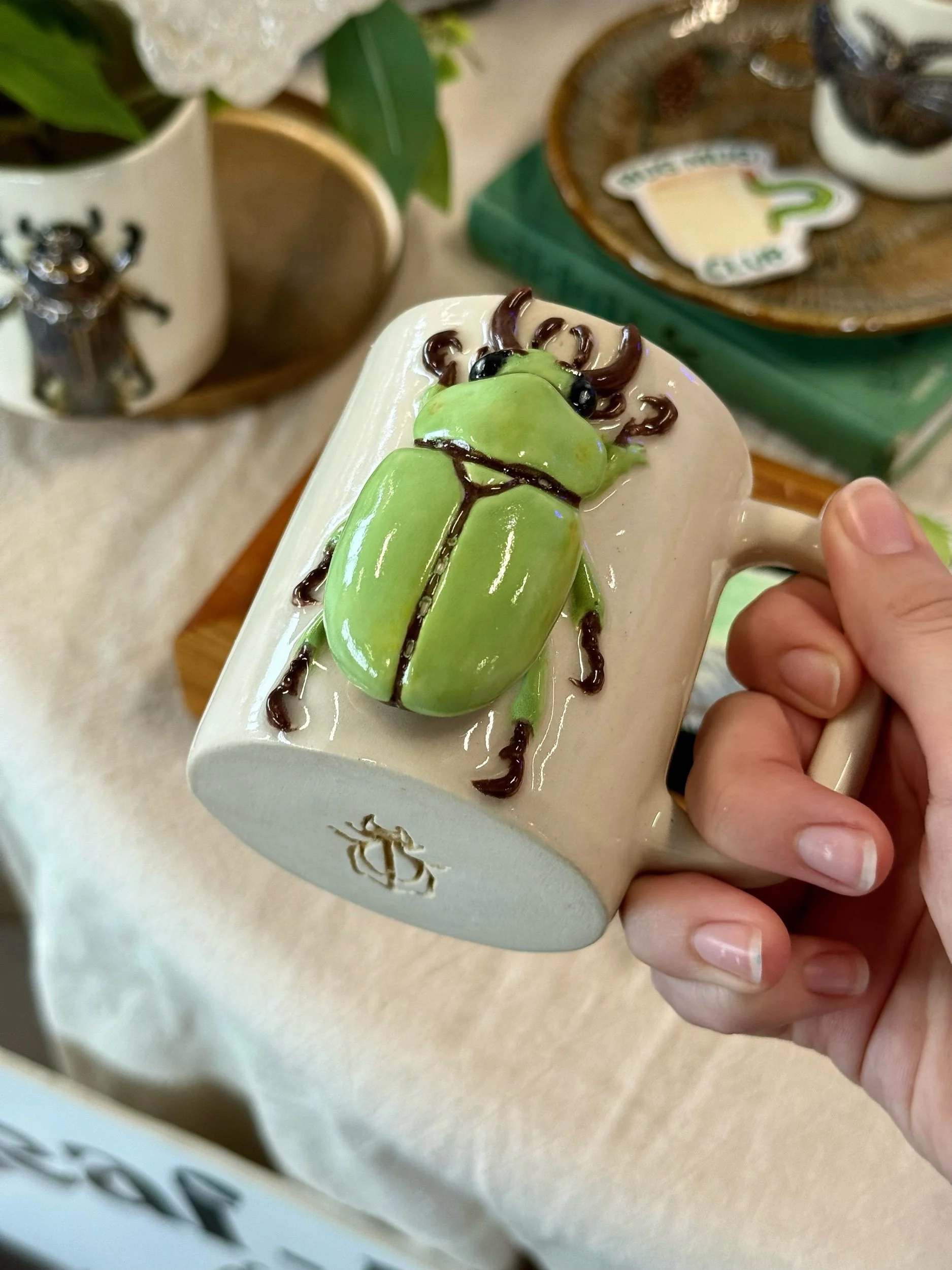 This ripening cherry tomato mug is handbuilt and sculpted using white stoneware. The insect is decorated with underglaze and a clear glaze layered on top. The piece is fired in a kiln to full vitrification and thus is food-safe. The materials used are dishwasher/microwave safe, though this ceramic piece is fragile, so handle with care.