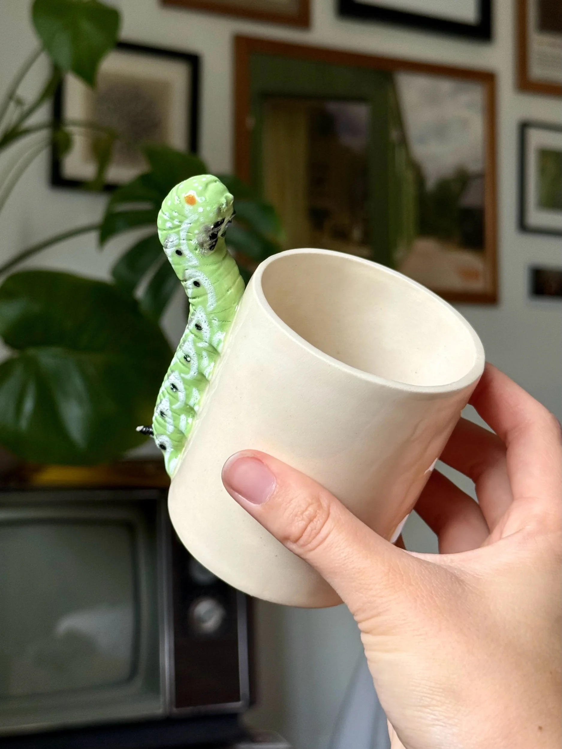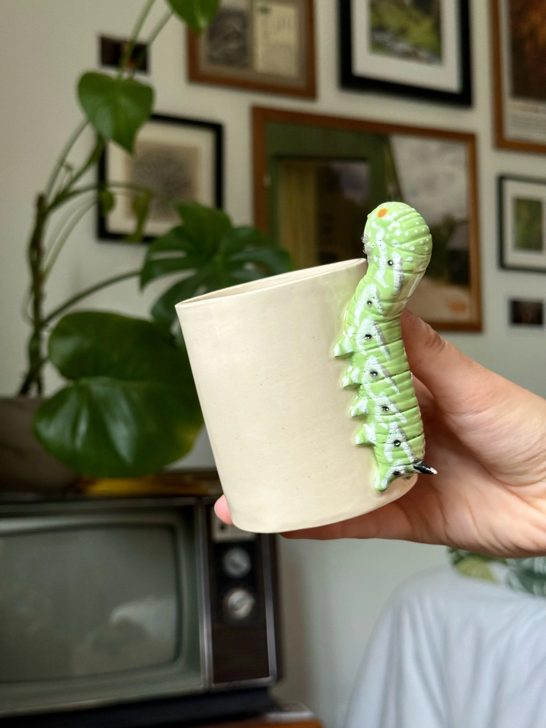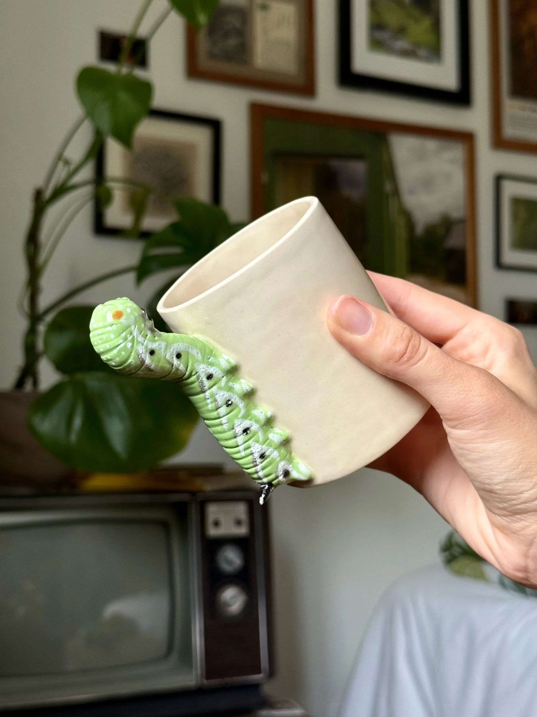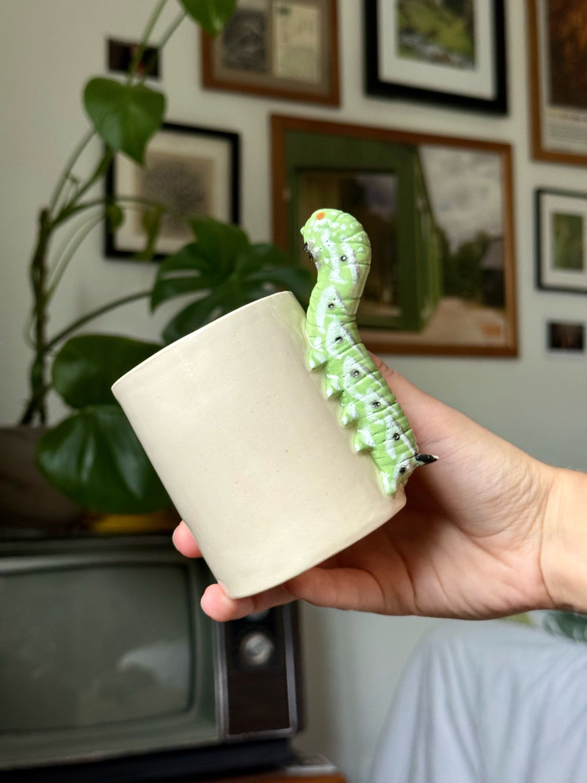 This tomato hornworm mug is handbuilt and sculpted using white stoneware. The insect is decorated with underglaze and a clear glaze layered on top. The piece is fired in a kiln to full vitrification and thus is food-safe. The materials used are dishwasher/microwave safe, though this ceramic critter is fragile, so handle with care.