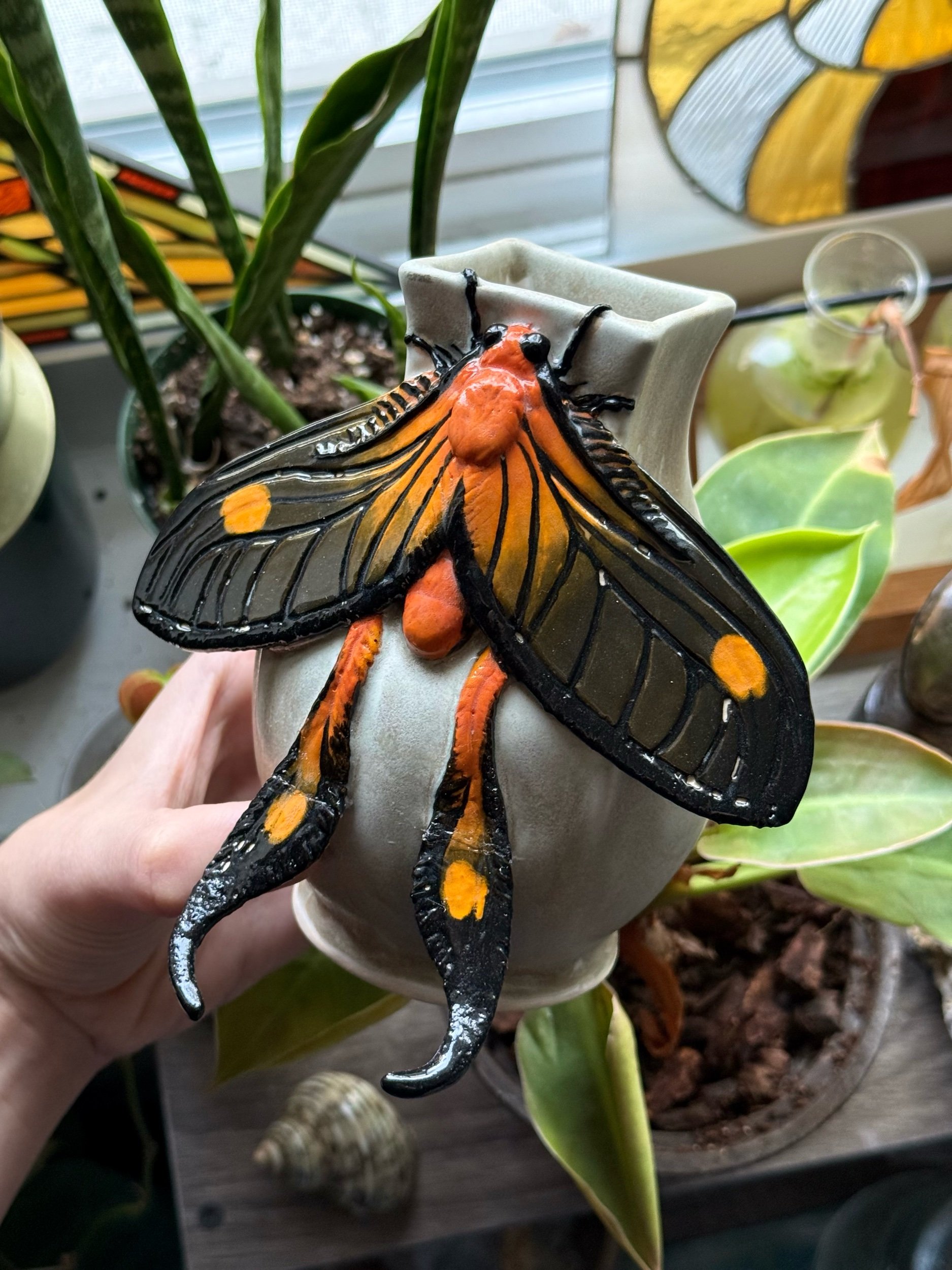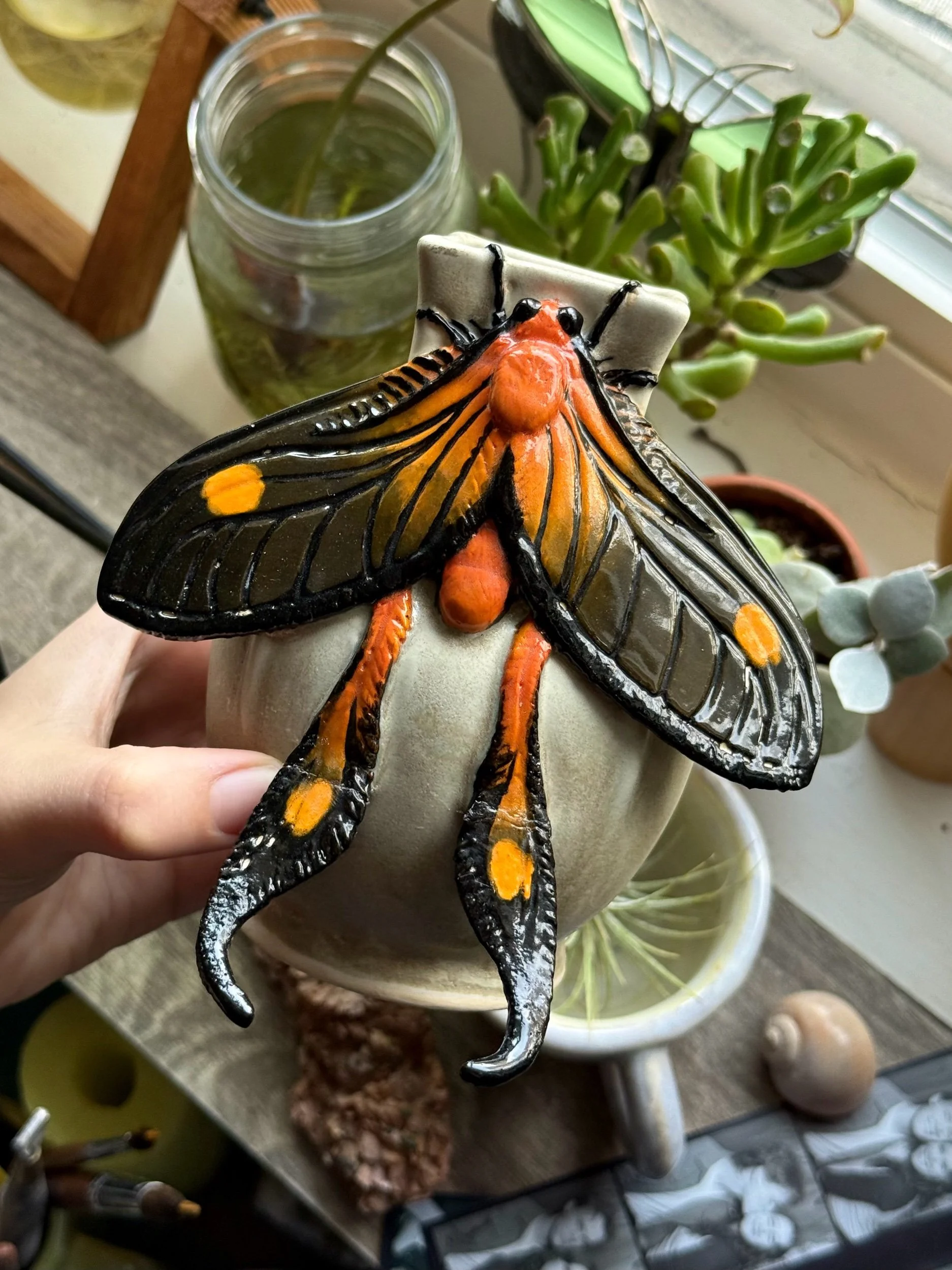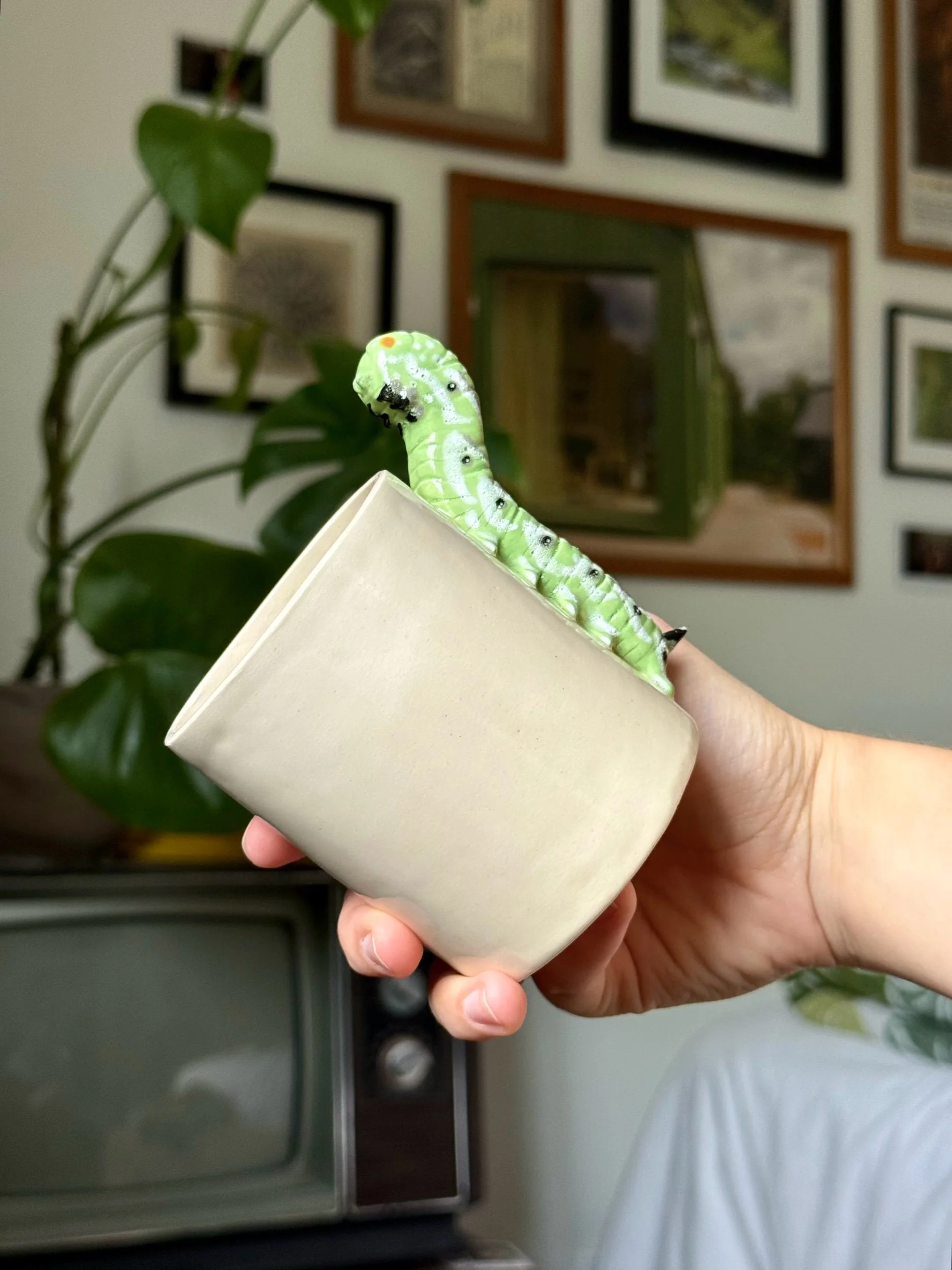 This tomato hornworm mug is handbuilt and sculpted using white stoneware. The insect is decorated with underglaze and a clear glaze layered on top. The piece is fired in a kiln to full vitrification and thus is food-safe. The materials used are dishwasher/microwave safe, though this ceramic critter is fragile, so handle with care.