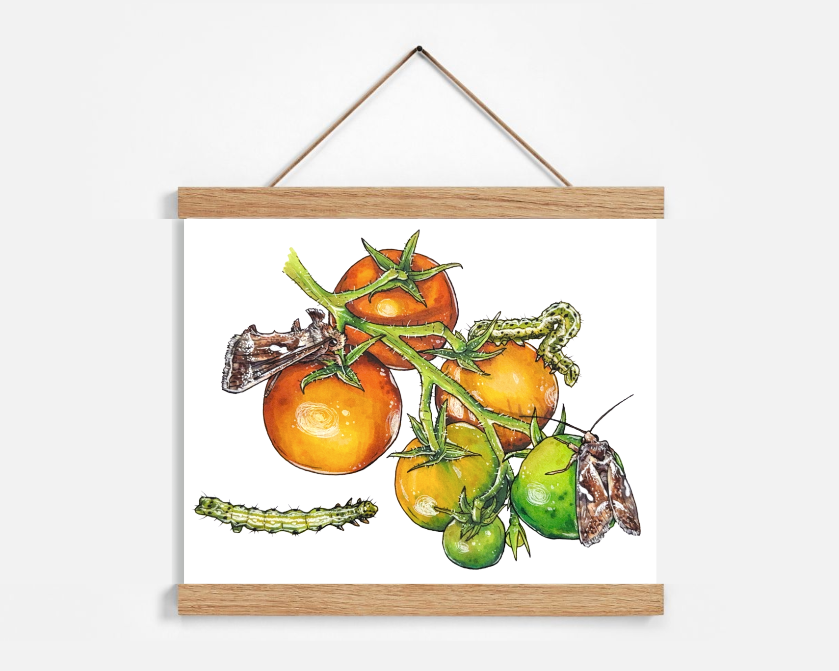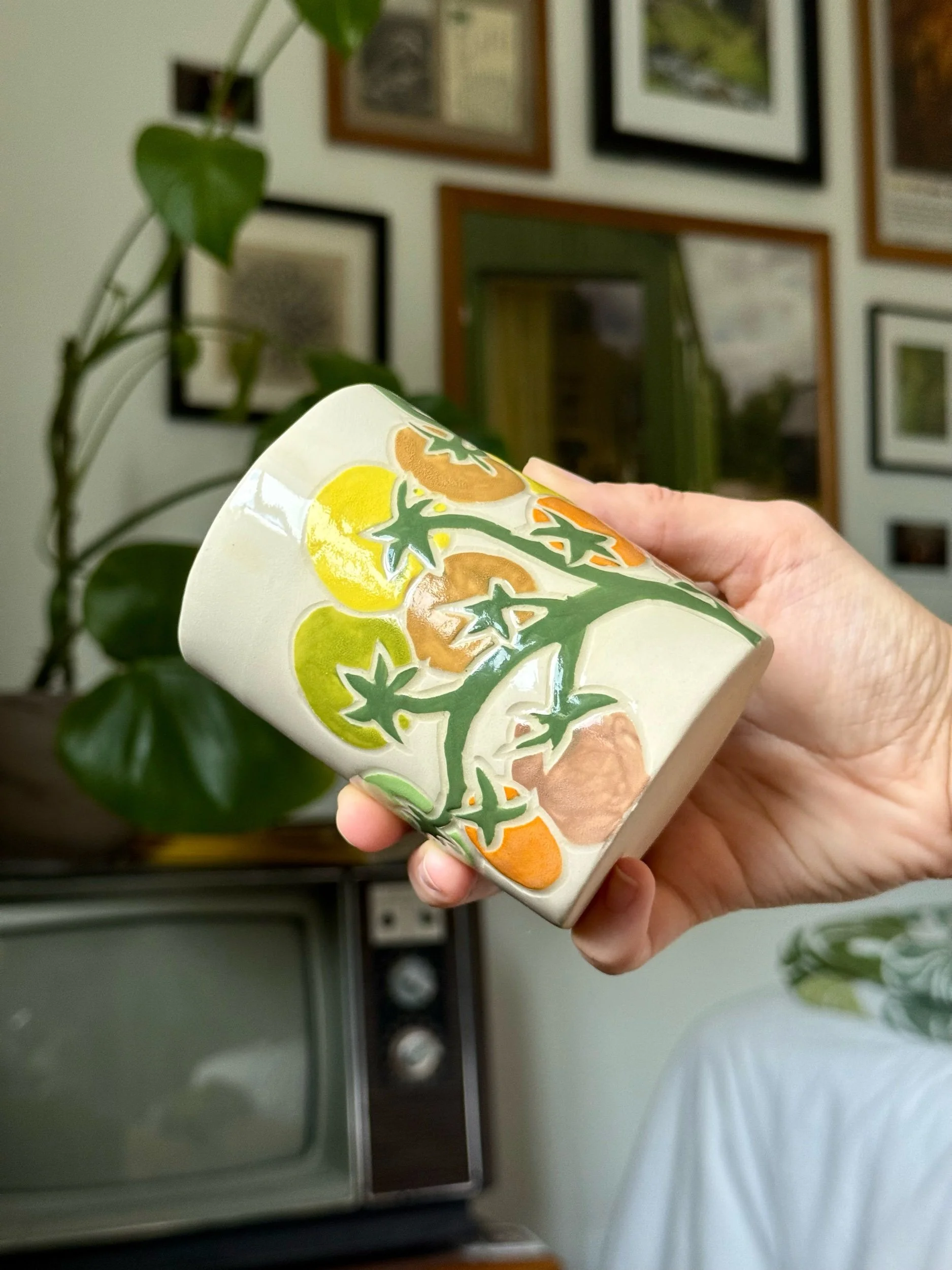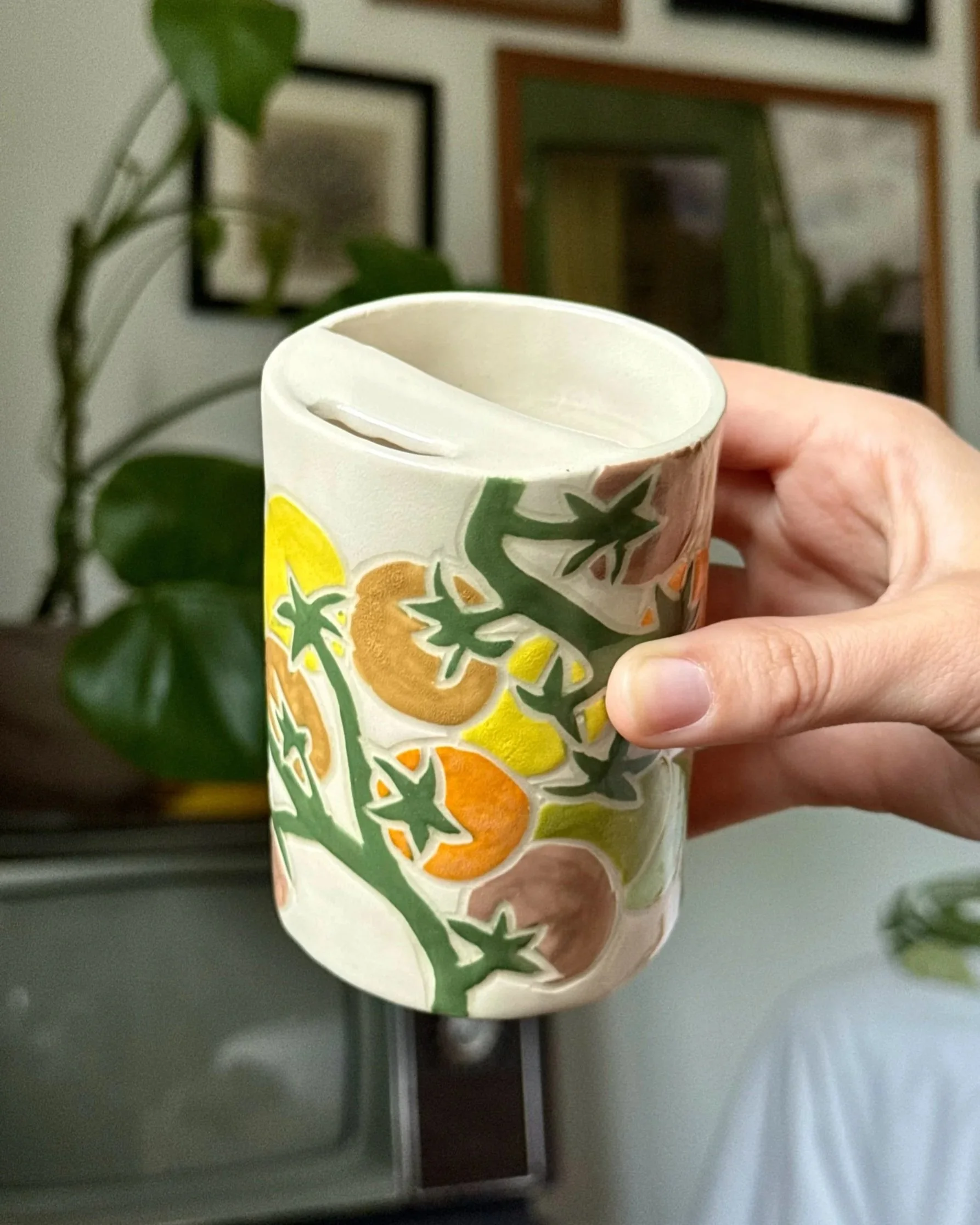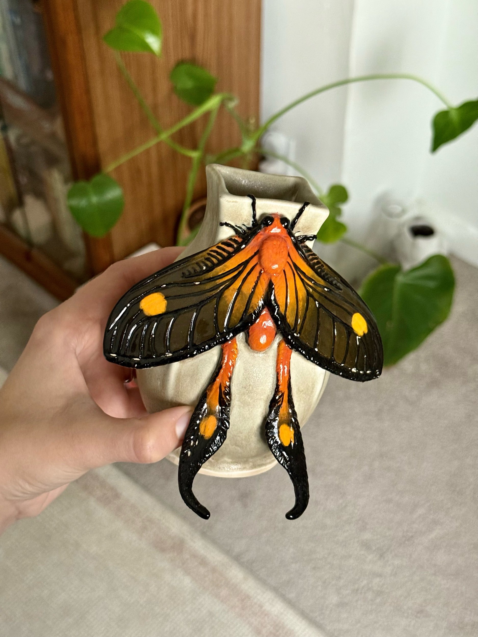 This tomato hornworm mug is handbuilt and sculpted using white stoneware. The insect is decorated with underglaze and a clear glaze layered on top. The piece is fired in a kiln to full vitrification and thus is food-safe. The materials used are dishwasher/microwave safe, though this ceramic critter is fragile, so handle with care.